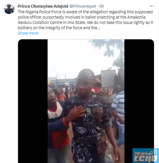 Sharing the viral video, Adejobi said, “The Nigeria Police Force is aware of the allegation regarding this supposed police officer purportedly involved in ballot snatching at the Amakohia Ikeduru Collation Centre in Imo State.