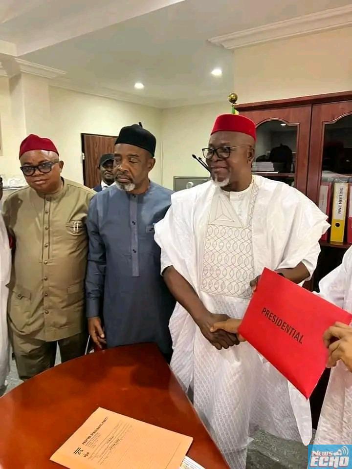 A picture of a former Speaker of the Abia State House of Assembly Hon. Chikwendu Kalu and a former Abia Commissioner of Trade and Investment, Hon. Cosmos Ndukwe with their purchased presidential expression forms sent tongues wagging.